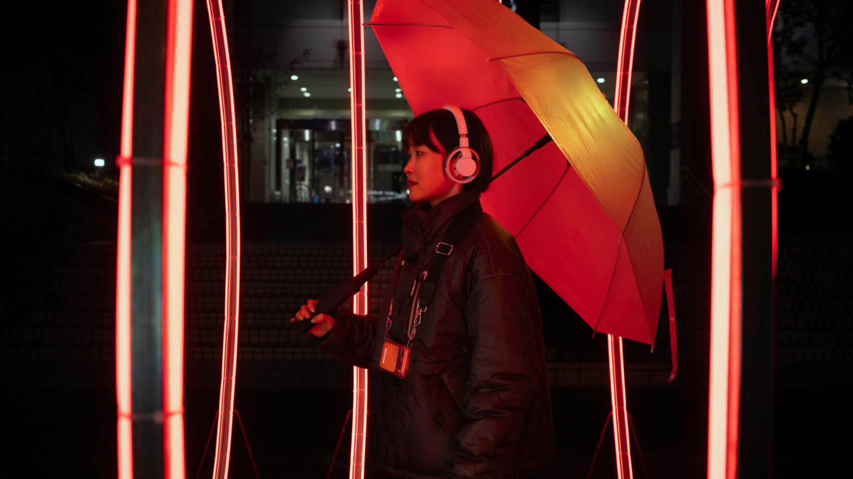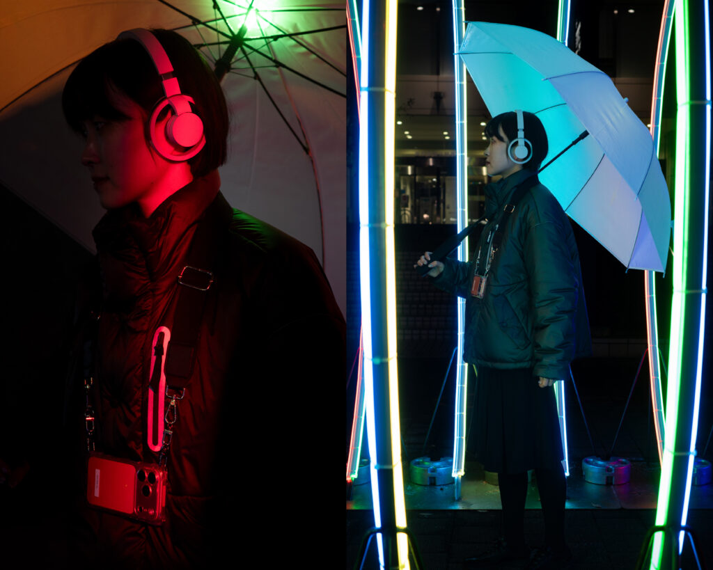 空間移動に応じて音声が流れ・切り替わるAurisの基本的な機能に加え、今回は外部機器と連携させる機能「フィジカルエンド」を活用。Aurisと、株式会社スプラインデザインハブが開発した光と振動によるフィードバックを備えた傘型デバイスを連動させることで、物語の進行に応じて、傘が発光し、場面によっては振動する演出を実現。
